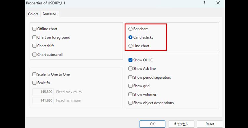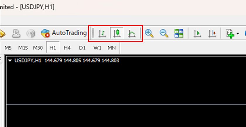 In MT4 charts, you can display three types of charts: candlestick, bar, and line charts.