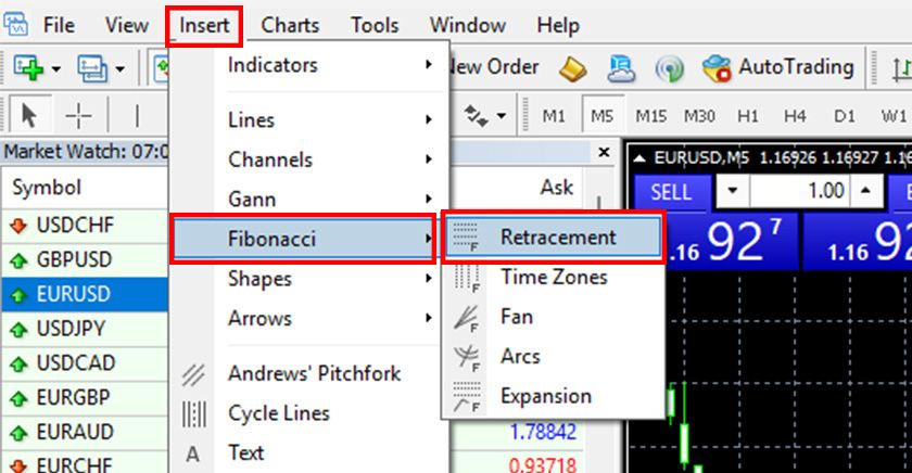 Select "Insert" → "Channels" → "Fibonacci" from the menu.