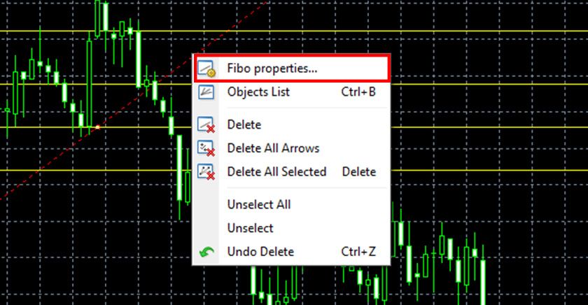Right-click on the selected Fibonacci Retracement baseline and choose "Fibo Properties" from the menu to open the line properties window.