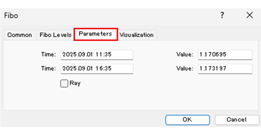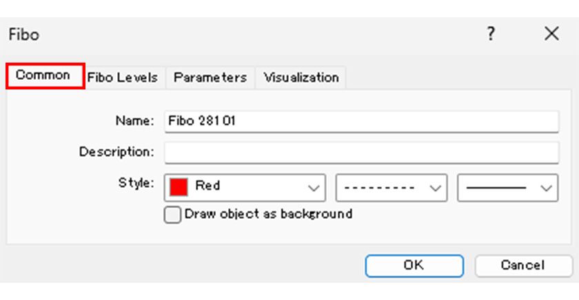 The window includes four tabs: "Common," "Fibonacci Levels," "Parameters," and "Visualization," where detailed settings can be configured.