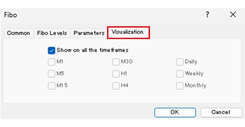 In the "Visualization" tab, you can specify the timeframes where the Fibonacci Retracement is displayed. Unchecking "Show on All Timeframes" allows you to display it only on selected timeframes.