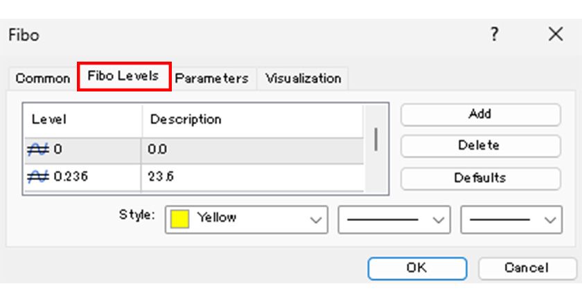 In the "Fibonacci Levels" tab, you can configure the horizontal line levels to be drawn.