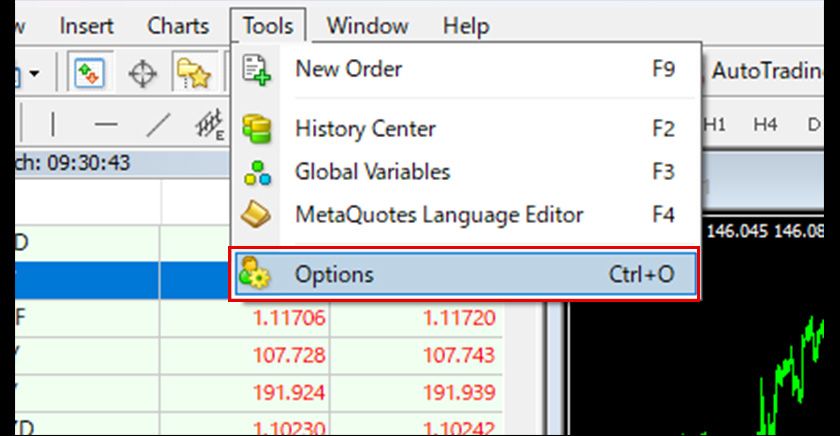 First, configure the settings to not connect to the server to avoid receiving new data. While logged into a TitanFX account (a demo account is fine) on the MT4 prepared for backtesting, select "Options" from the "Tools" menu.