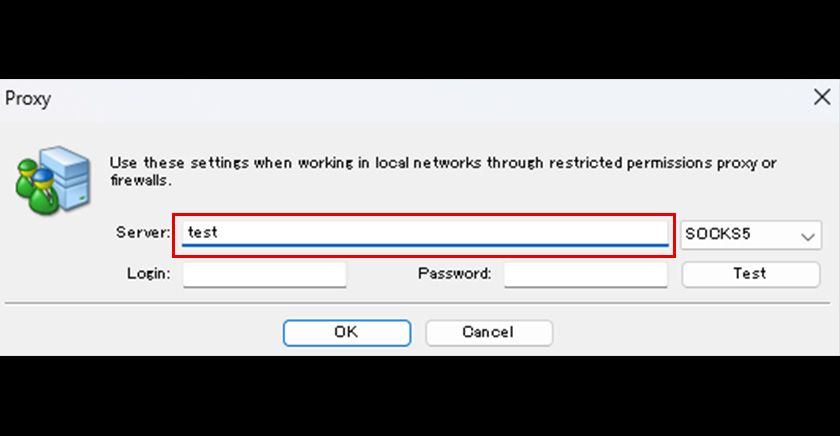 In the "Proxy" dialog that appears, enter appropriate alphanumeric characters in the "Server" section and click "OK".