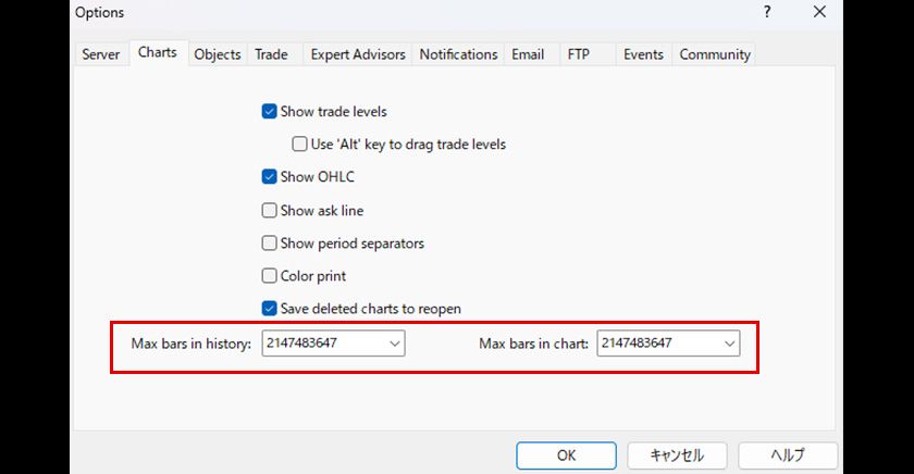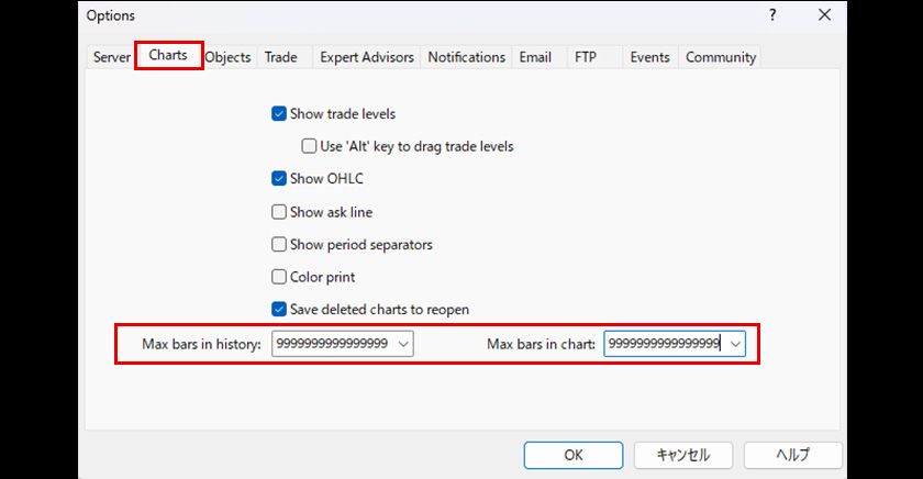 When you reopen the "Options" dialog, it will be set to the maximum values. Once done, restart MT4. After restarting, "No connection" will be displayed in the bottom right of MT4, and no new rates will be received.