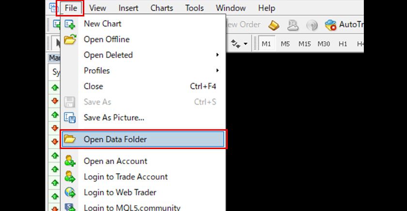 To avoid mixing with the data to be imported, delete the historical data held in MT4. Select "Open Data Folder" from the "File" menu in MT4.