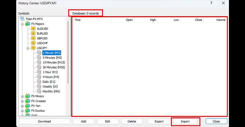 Select the 1-minute data of the instrument you want to import from the left side of the "History Center" dialog that appears. Make sure there is no data in the state, and click the "Import" button below.