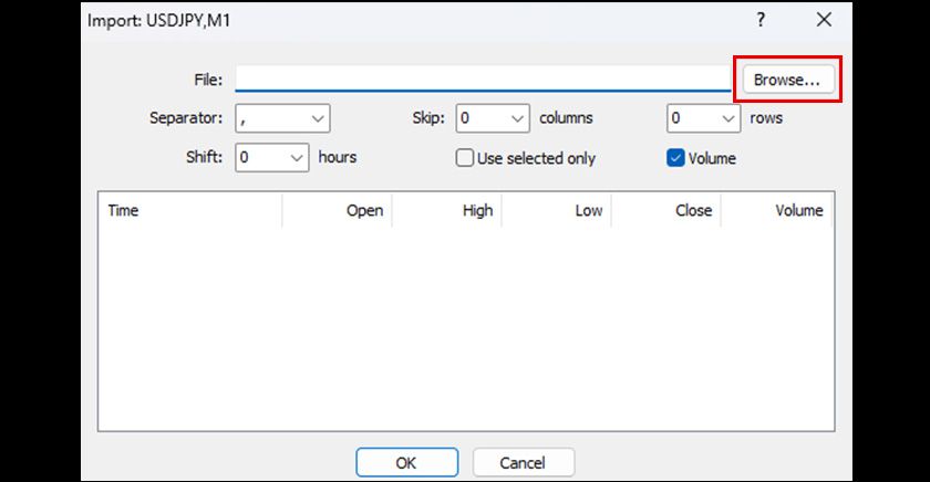 In the "Import" dialog that appears, click the "Browse" button on the right of the filename, and select the file of the 1-minute data to be imported.