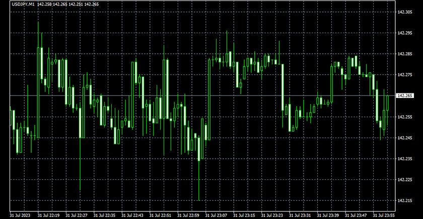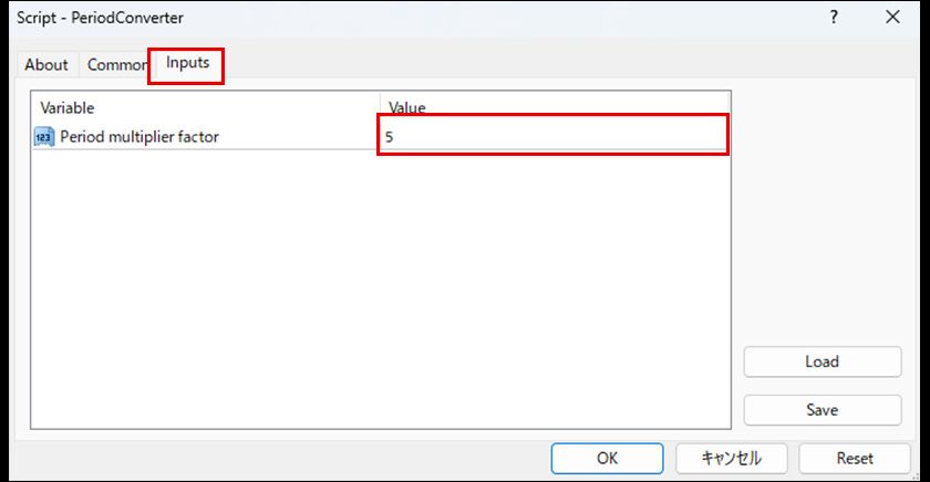 Once the offline chart is displayed, drag and drop the "PeriodConverter" from the "Scripts" in MT4's "Navigator" onto the chart. In the "Parameter Input" tab of the settings screen that appears, enter "5" in the "Period multiplier factor", click "OK", and the 5-minute data is generated. Then, repeat the process with the "PeriodConverter" on the chart for other timeframe data (15 (15-minute), 30 (30-minute), 60 (hourly), 240 (4-hour), 1440 (daily), etc.), similarly creating the data. When prompted with the dialog "Do you want to stop the PeriodConverter and apply PeriodConverter to the chart xxxx, M1?" during subsequent drops of the "PeriodConverter" onto the chart, click "Yes" to continue.