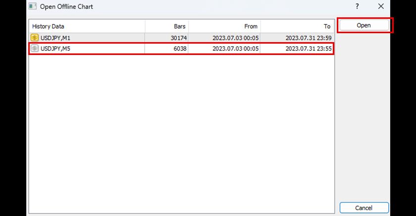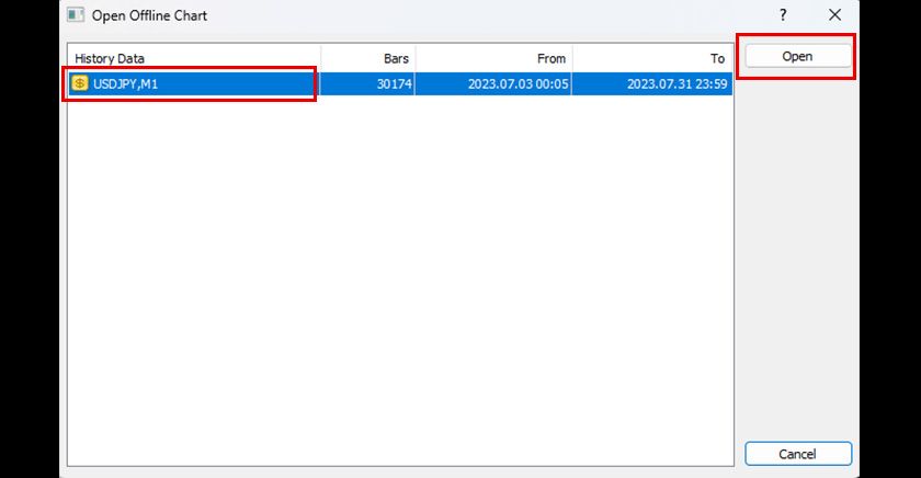 Select the 1-minute data (Instrument name, M1) of the imported currency pair, and click the "Open" button on the right.