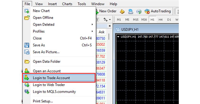 If no login dialog appears or if logging into an installed MT4, select 'Login to Trade Account' from the 'File' menu in MT4, and the login dialog will appear.