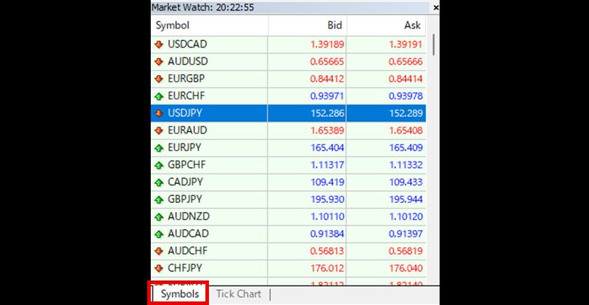 You can display the prices of each symbol. In MT4, you can also display the charts for the symbols shown here, as well as open new charts or change the symbols on existing charts.