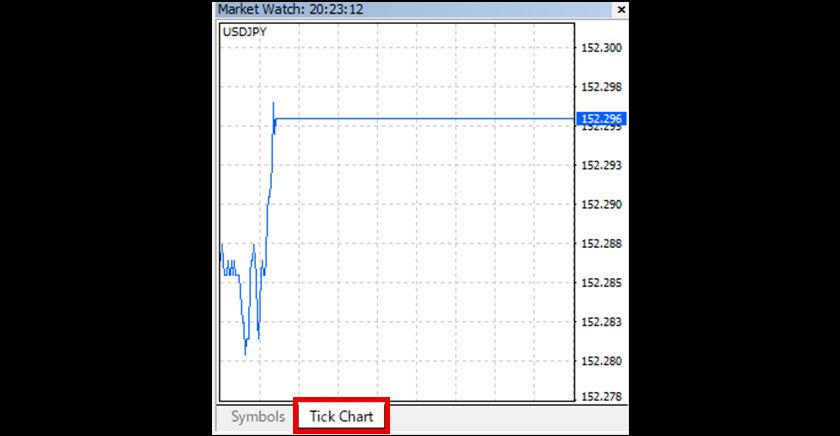 Displays the tick chart for a selected symbol. Used when you want to check the most recent fine price movements.