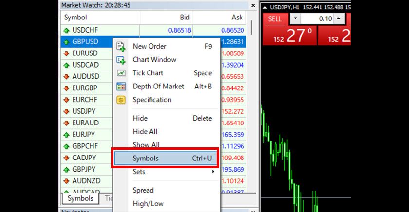 Right-click on the Market Watch, and select 'Symbols' from the menu that appears.