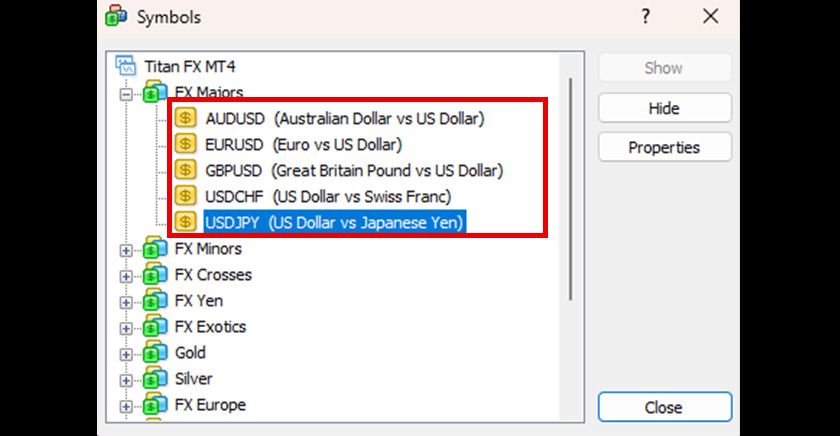 The categories (upper row) and symbol names (lower row) that can be displayed in TitanFX's MT4 are as follows: