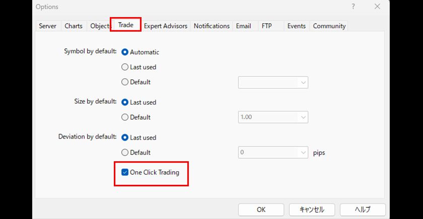 ② At the bottom of the options screen, check the box for 'One-Click Trading'.