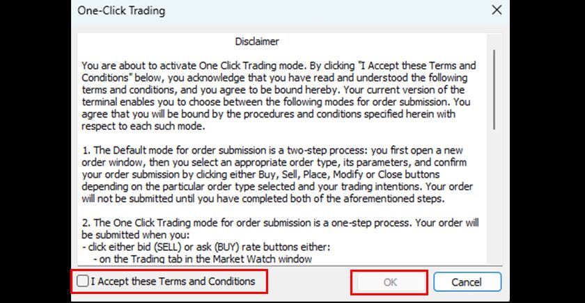 ③ A disclaimer for one-click trading will appear; review the content, check 'I Accept these Terms and Conditions', and click 'OK'.