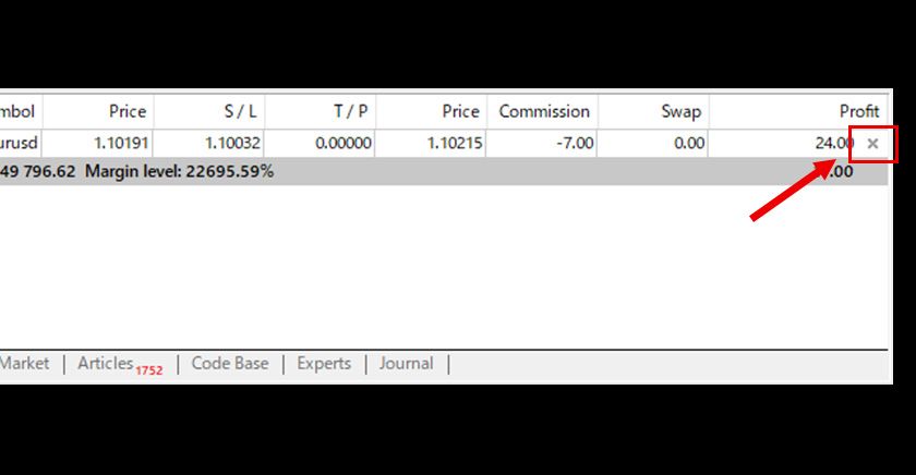Right-click on the position you want to close in the 'Trade' tab of the Terminal and select 'Close Order' to close it.