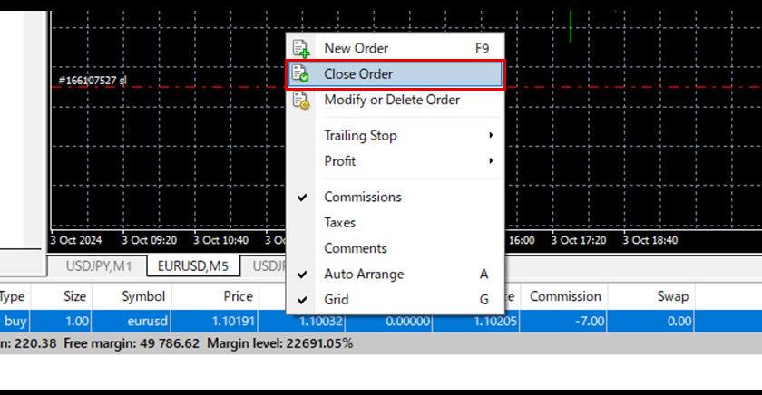 Right-click on the line representing the position or closing order on the chart and select 'Close' from the menu that appears.
