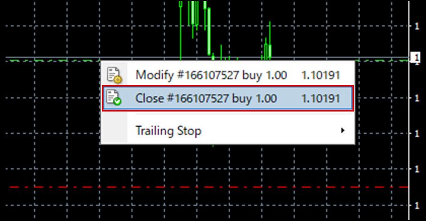 Right-click on the line representing the position or closing order on the chart, and select 'Close' from the menu that appears.