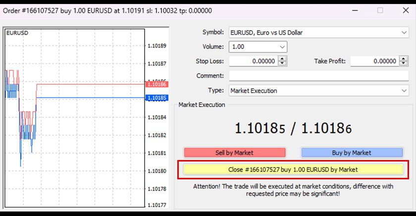 Click the yellow market close button in the displayed Order Placement Window to complete the closure.