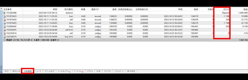 The swap points for closed positions are displayed in the "Swap" column within the "Account History" tab of the terminal.