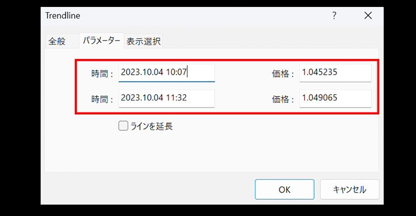 On the "Parameters" tab, set the start and end positions by time and price, and configure line extensions.