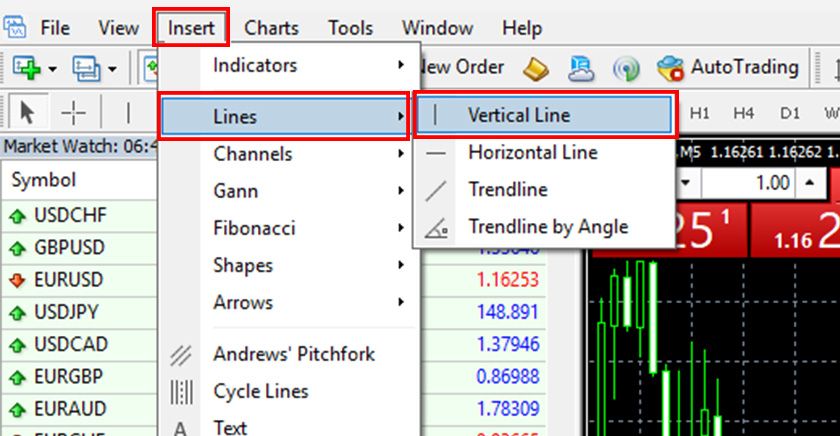Select "Insert" → "Lines" → "Vertical Line" from the menu.