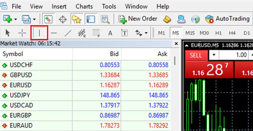 To draw a vertical line, switch the cursor to vertical line mode. There are two ways to do this: