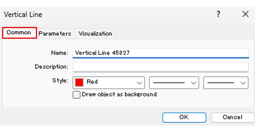 The "Common" tab allows you to specify the line's name, description, color, thickness, and type.