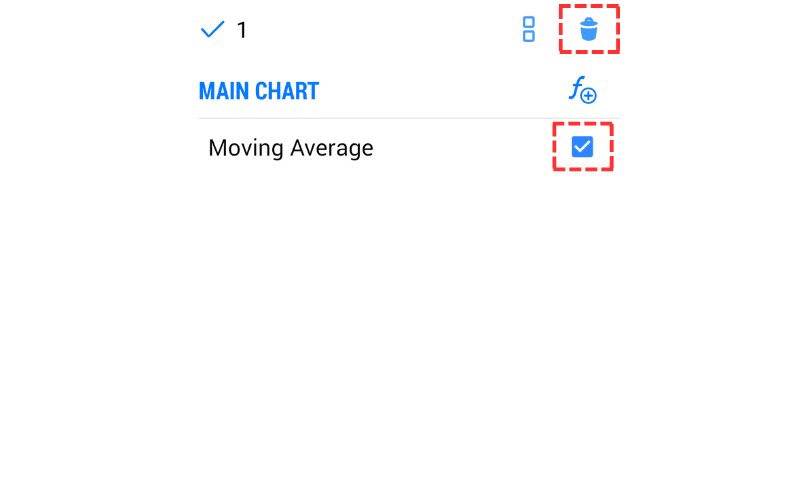 To remove an unwanted indicator, tap the indicator icon (resembling an 'f') at the top of the chart, display the list of indicators, tap the trash can icon in the top right, check the box next to the indicator you wish to delete, and tap the trash can icon again to remove the indicator.