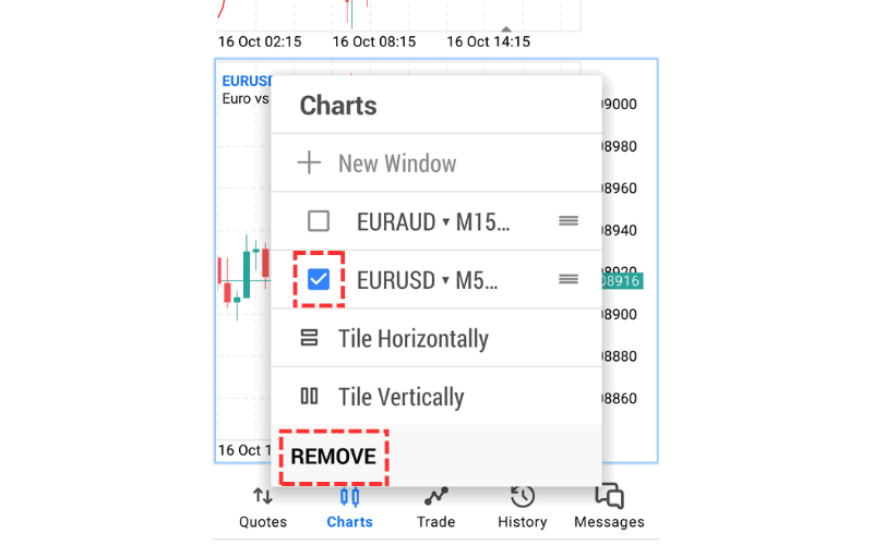 To delete a chart, tap the chart addition icon, check the chart you want to remove from the menu that appears, and tap 'REMOVE' at the bottom of the menu to remove the chart.