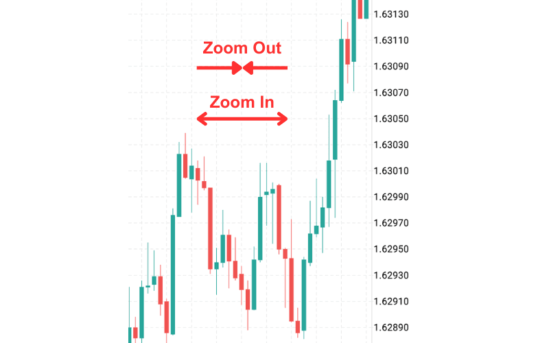 To zoom in and out on the chart, use pinch out and pinch in gestures directly on the chart.