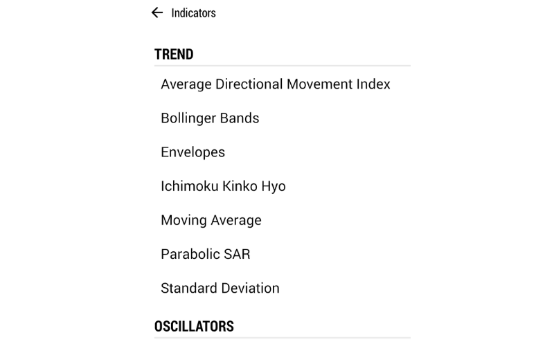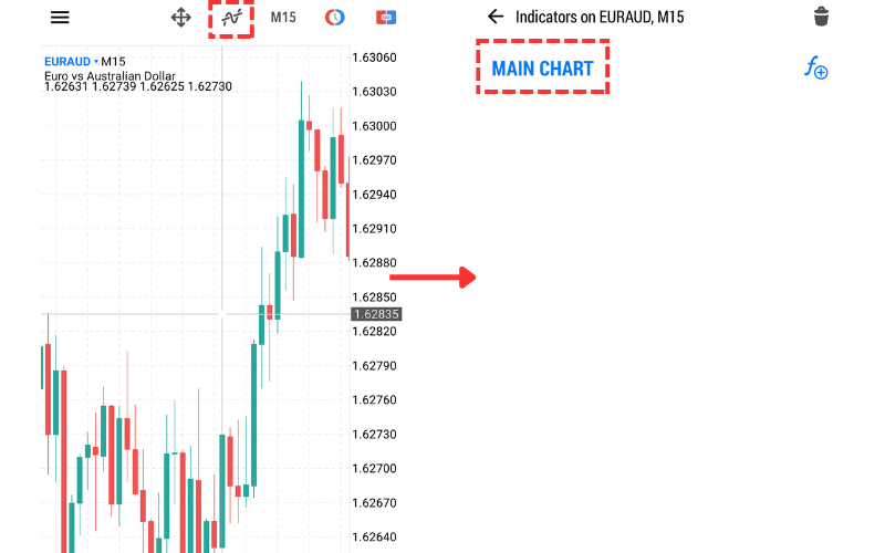 To display indicators, tap the indicator icon (resembling an 'f') at the top of the screen, and then tap 'Main Chart' on the 'Indicator' screen.