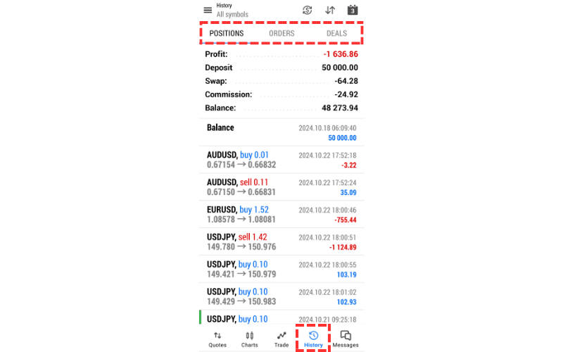 By tapping 'History' from the bottom menu, you can display your trading history. You can view it in three ways: 'Positions' displayed per position, 'Orders' displayed per order, and 'Deals' displayed per transaction. You can switch between these display methods using the tabs at the top of the screen.