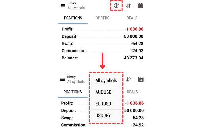 By tapping the '$' icon at the top of the trading history screen, you can filter the symbols to be displayed in your trading history.