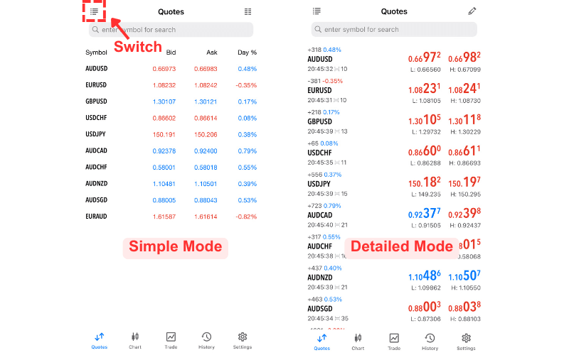 In the MT5 iOS app's Market Watch screen, you can choose between two modes: a Simple Mode that displays basic information like bid/ask prices and change rates, and a Detailed Mode that shows change rates, last updated time, spreads, high and low prices, and more.