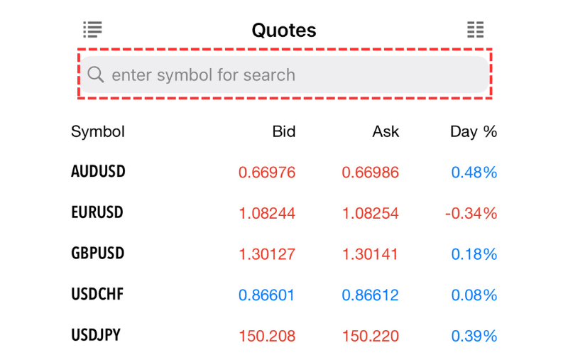 To add a symbol, type the symbol name in the search bar at the top of the Market Watch, then tap the '+' button next to the symbol name displayed, or tap the search bar and then tap the category below to select a symbol from the displayed list and tap the '+' button next to the symbol you want to add.