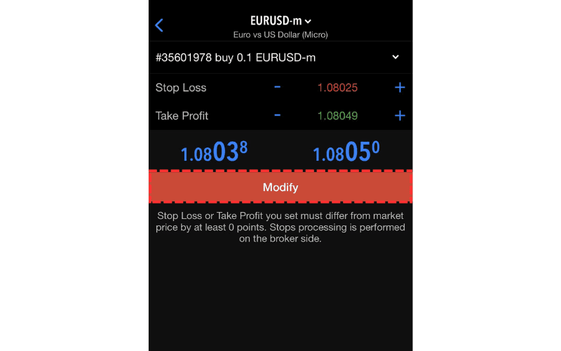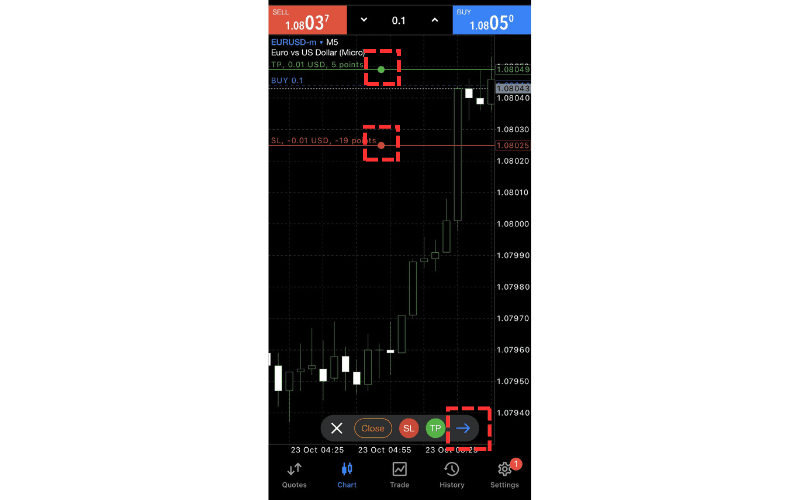 Tap 'TP' or 'SL', and lines indicating the levels will appear on the chart. Slide to the desired level for your Take Profit or Stop Loss and tap the arrow on the right side to submit the order modification.