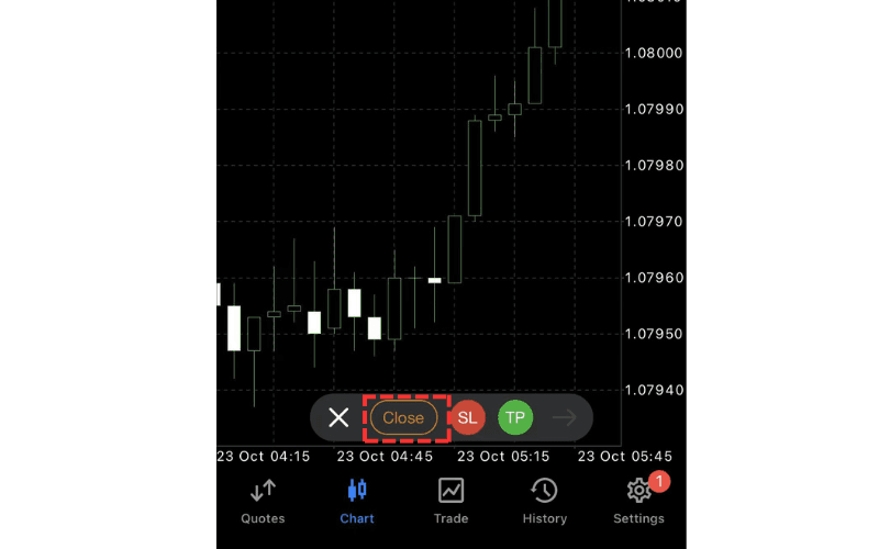 Tap on the level line of the position on the chart, and buttons for 'Close', 'SL', and 'TP' will appear at the bottom of the chart.