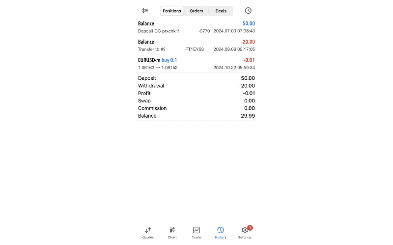 Trade history is displayed in three formats: 'Positions', 'Orders', and 'Deals'.