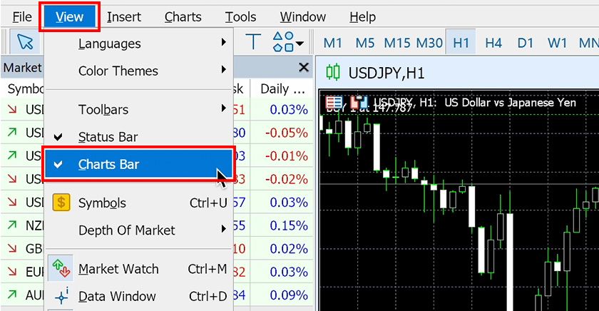 Here, we provide instructions on how to toggle the display of the chart bar. Please use this if you wish to hide the chart bar or if it has become hidden for any reason and you want to display it again.