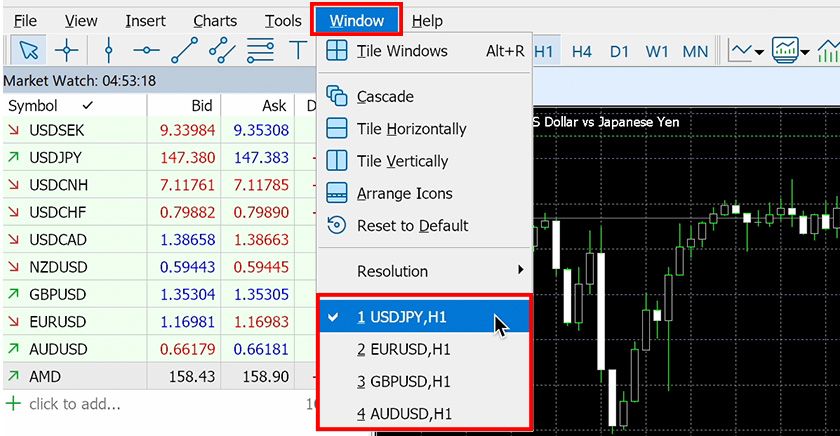 MT5 displays the chart bar at the bottom of the chart area by default. This chart bar allows you to switch between charts and toggle their display.