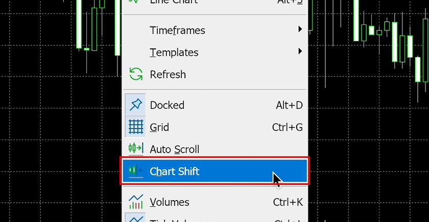 Right-click on the chart, and from the menu that appears, click 'Chart Shift' to toggle the shift on and off.