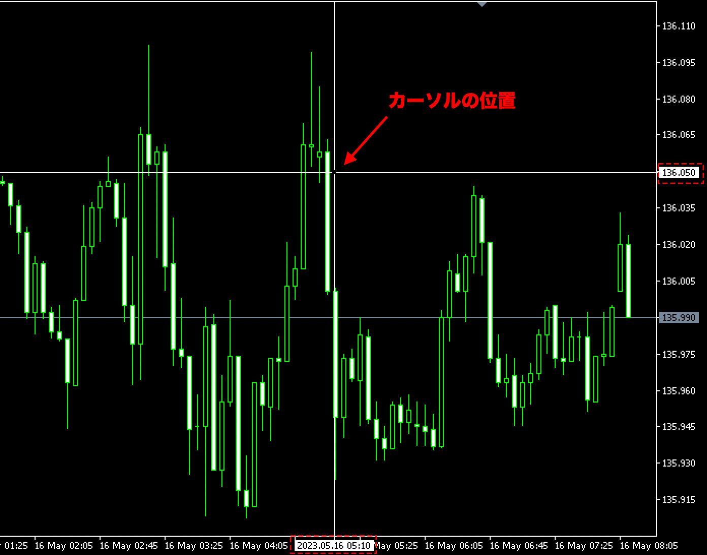 When you move the cursor in crosshair mode on the chart, the price and time at the cursor's position are displayed on the scale part.