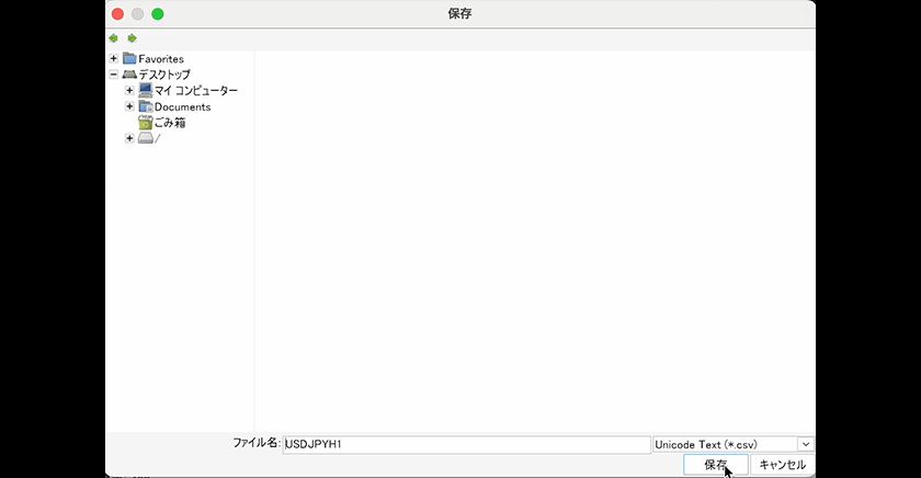 Select the location where you want to save the file, enter the file name in "File name," choose "Unicode Text (*.csv)" as the file type, and click "Save" to store the price data in CSV format.