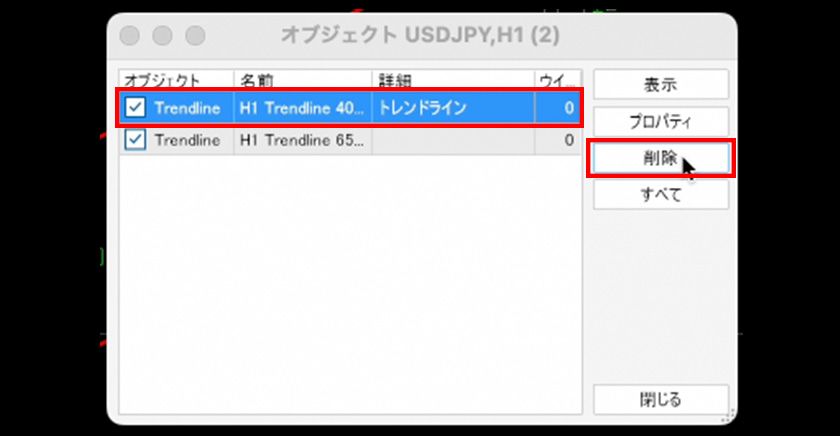 Select the line you want to delete from the displayed list, then click the "Delete" button on the right to remove the trendline.
