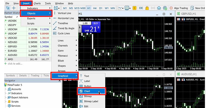 In MT5, you can display small charts (mini charts) on your main chart. Mini charts allow you to change symbols, timeframes, and display multiple instances, offering a high degree of customization.