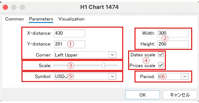 In the "Parameters" section of the displayed window, you can adjust the display position (①), size (②), zoom (③), scale display (④), symbol (⑤), and timeframe (⑥).