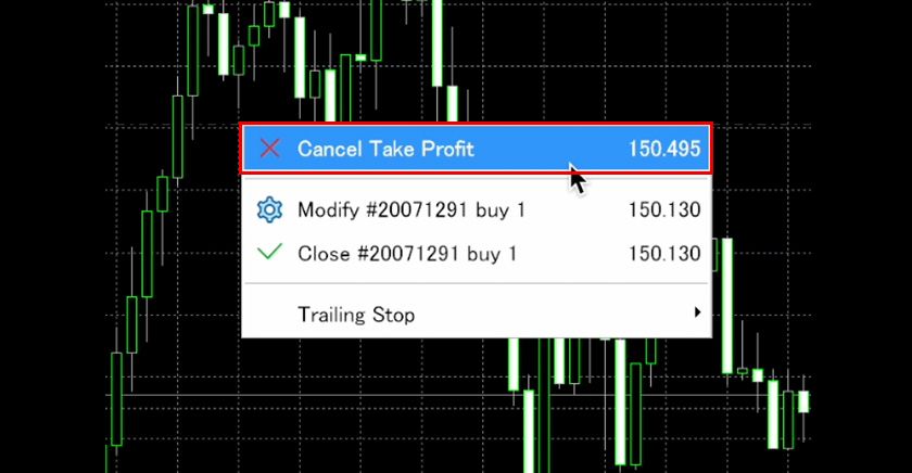 If you want to cancel an already placed closing order, right-click on the line indicating the closing order on the chart and select 'Cancel Stop Loss (or Take Profit)'.